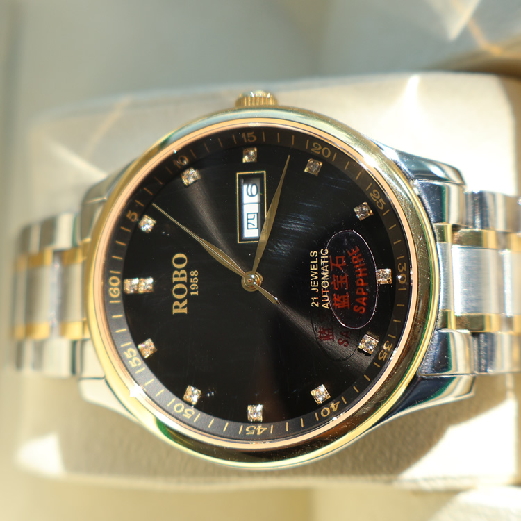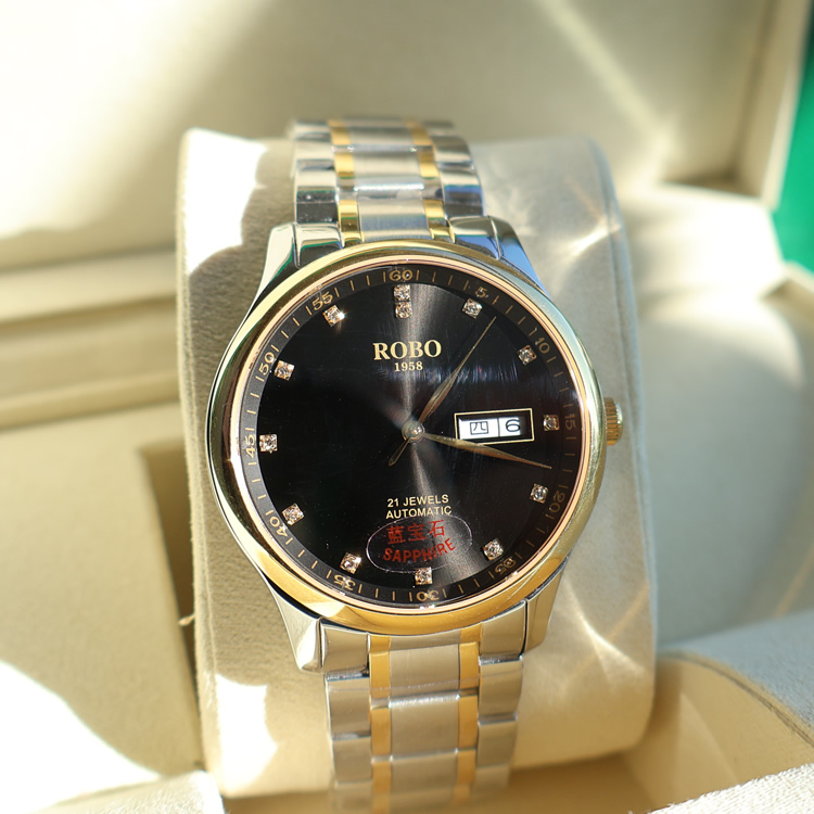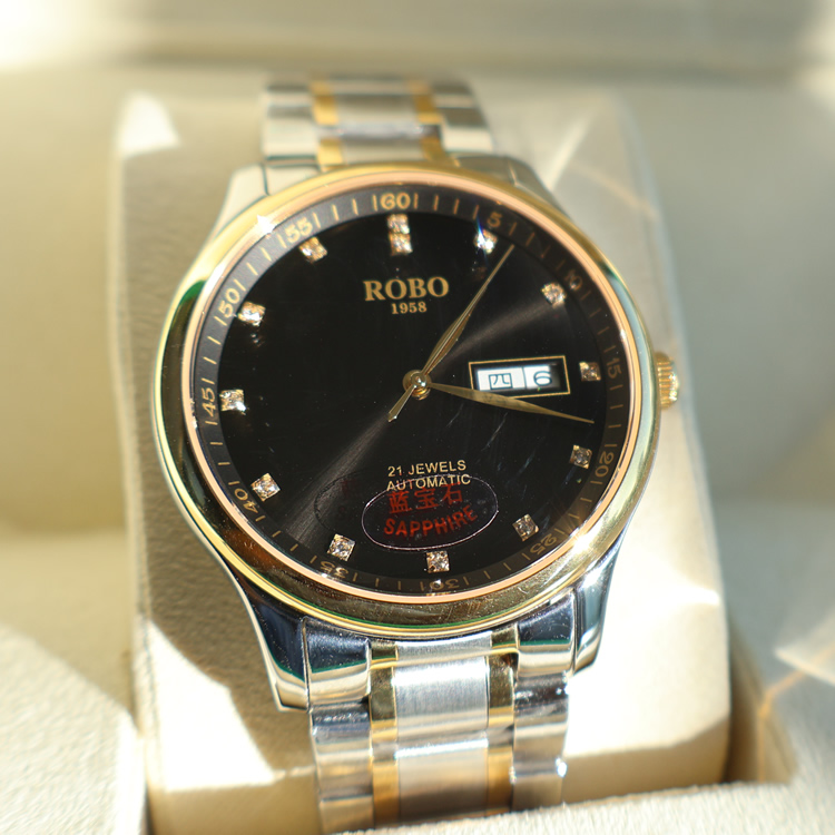 ROBO陆豹手表名匠系列精钢星期日历夜光防水走时精准时尚商务休闲全自动机械男士手表ROBO陆豹手表名匠系列双日历全自动机械腕表男士全自动机械腕表香槟金