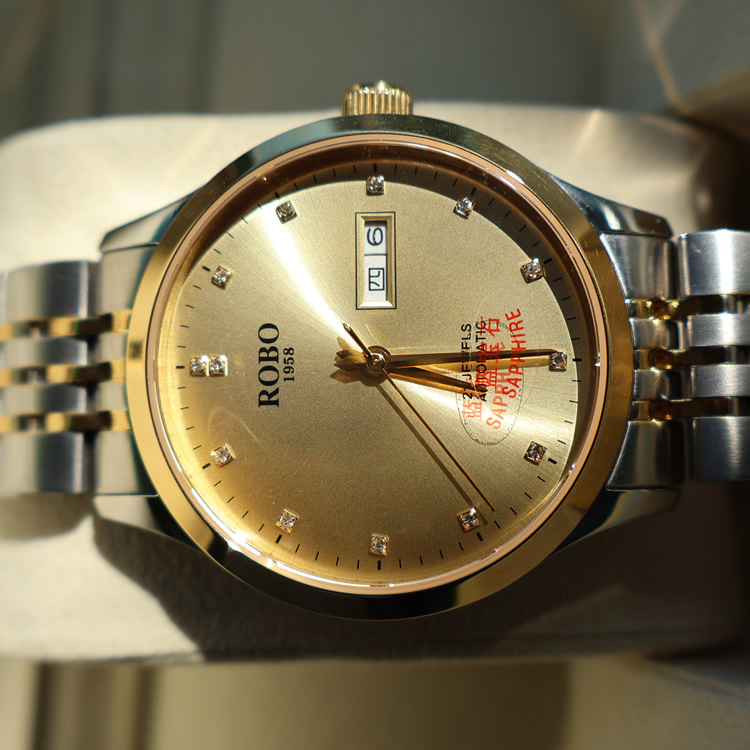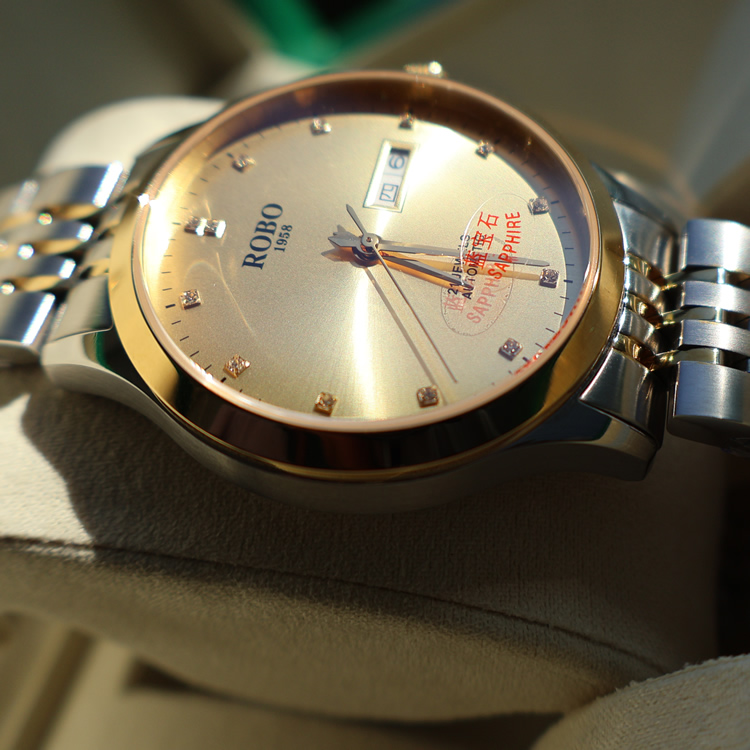 ROBO陆豹手表开创者系列精钢星期日历夜光防水走时精准时尚商务休闲全自动机械男士手表ROBO陆豹手表开创者系列双日历全自动机械腕表男士全自动机械腕表香槟金