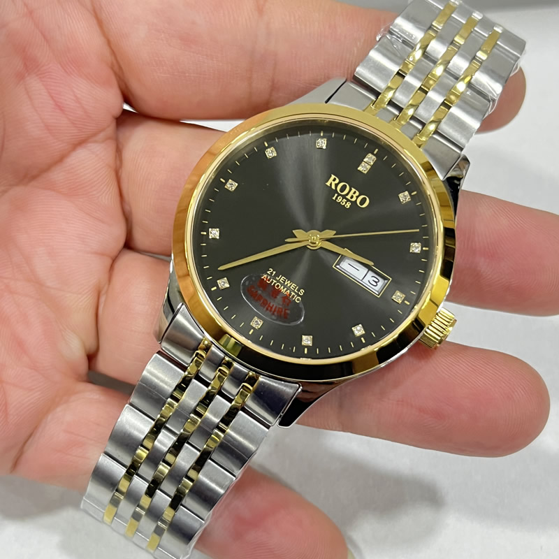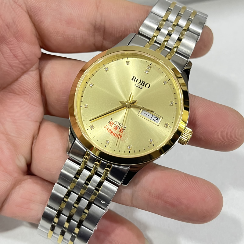 ROBO陆豹手表开创者系列精钢星期日历夜光防水走时精准时尚商务休闲全自动机械男士手表ROBO陆豹手表开创者系列双日历全自动机械腕表男士全自动机械腕表土豪金